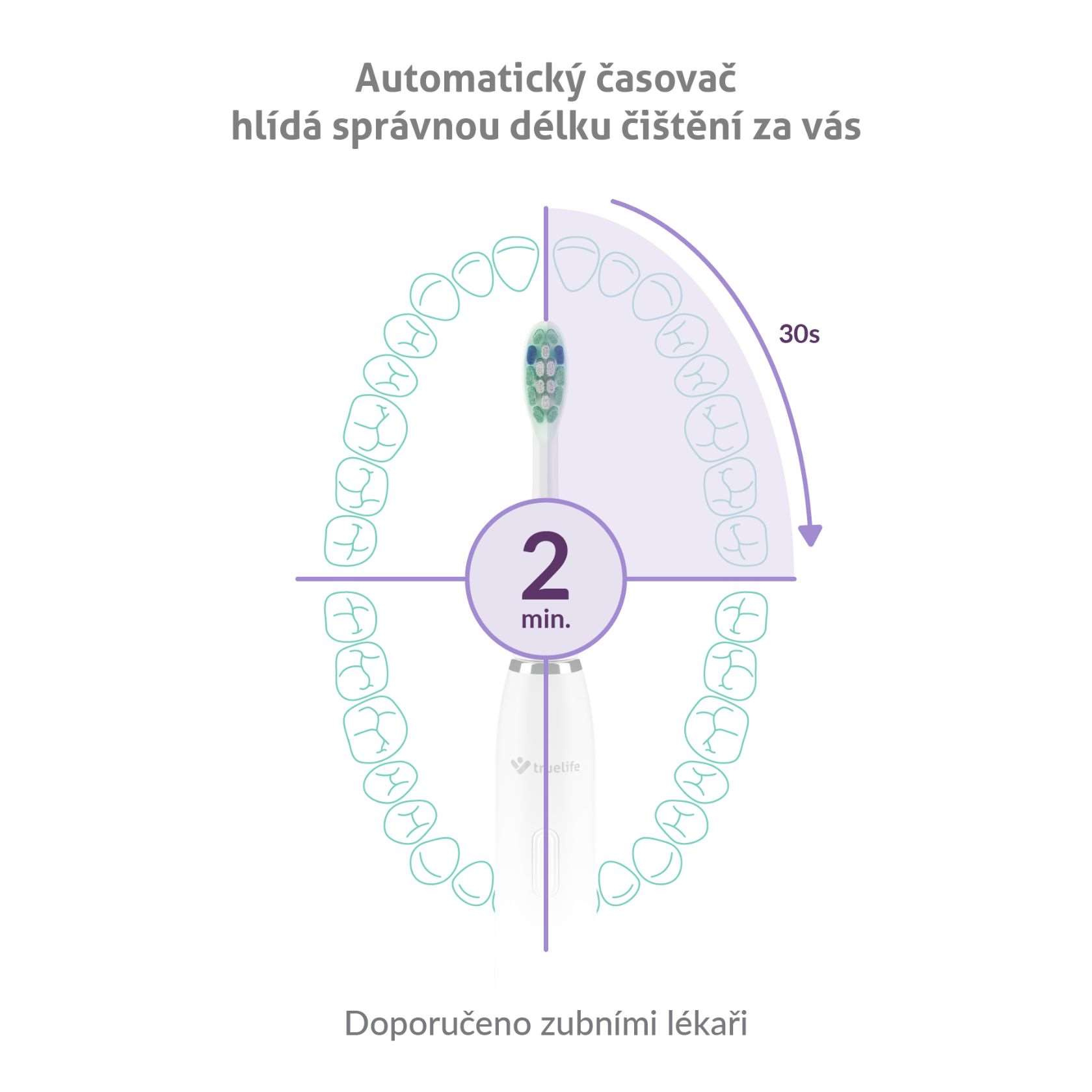 2minutový interval čištění je rozdělen do 4 sekcí. Po každých 30 sekundách nastane krátké přerušení, které upozorní, že je čas přesunout se k čištění další části chrupu.