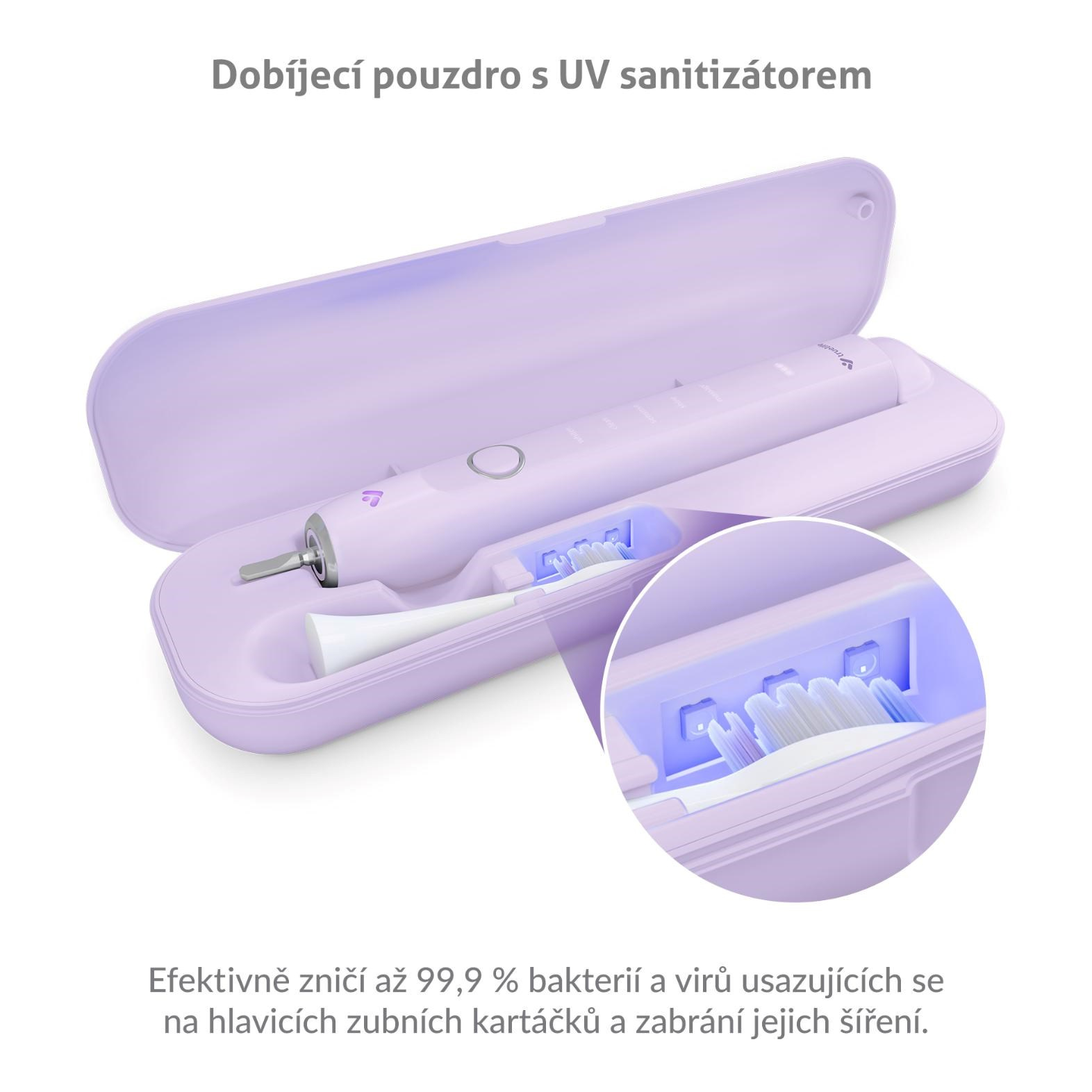 Chceme-li mít zdravé zuby a dásně, hygiena je zásadní. Sonický kartáček TrueLife SonicBrush Clean70 UV poskytuje nejen dokonalé čištění, ale také je vybaven dobíjecím pouzdrem s UV sterilizací. Stačí 5 minut k tomu, aby UV záření zničilo až 99,9 % bakterií a virů usazujících se na hlavicích zubních kartáčků. Sterilizace se spustí automaticky po vložení hlavice do pouzdra a časovač ohlídá její průběh. Pouzdro vydrží na jedno nabití až 17 dní při použití 2× denně.