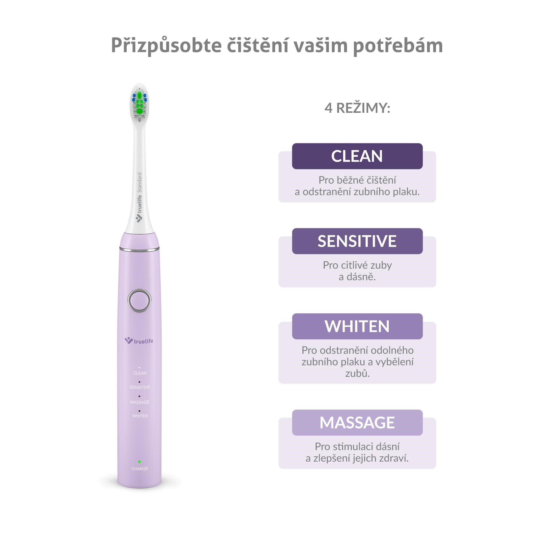 Kartáčky ze sady TrueLife SonicBrush Compact Duo nabízejí 4 režimy čištění, které se komplexně postarají o vaše ústa. Režim Clean je nejběžnější a hodí se pro každodenní používání. Citlivé zuby a dásně můžete s klidem svěřit režimu Sensitive. Ke krásnému bílému úsměvu vám pomůže režim Whiten a příjemnou masáž dásní zajistí režim Massage.