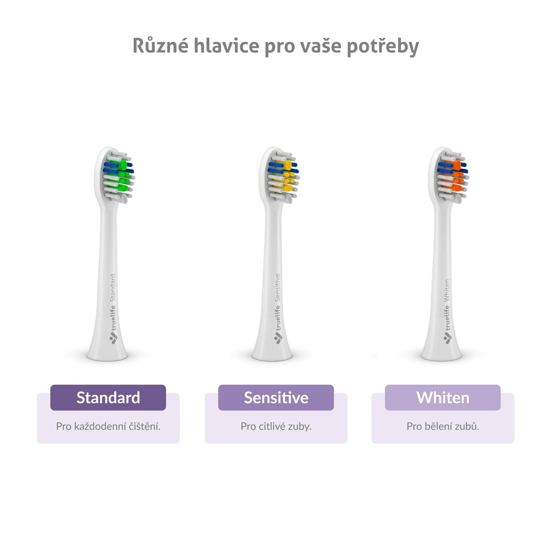 Součástí balení jsou 3 náhradní hlavice Compact různých typů – Standard pro běžné čištění, Sensitive pro citlivější zuby a Whiten pro bělící efekt.