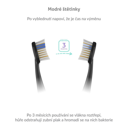 Hlavice disponují modrými štětinkami, které indikují míru opotřebení. Snadno poznáte, že je načase hlavici vyměnit.