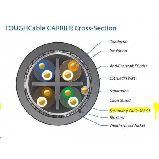 TOUGHCable CARRIER je speciálně designovaný stíněný SFTP kabel. Proti TOUGHCable PRO disponuje navíc kovovým opletením kolem hliníkové fólie podobně jako u koaxiálních kabelů pro SAT/TV techniku - zvyšuje odolnost vůči potenciálnímu rušení. Kabel kategorie Cat5e pro extrémní nasazení do nejnáročnějších meteorologických podmínek zásadně eliminuje rizika poškození venkovních aktivních prvků přepětím (ESD).