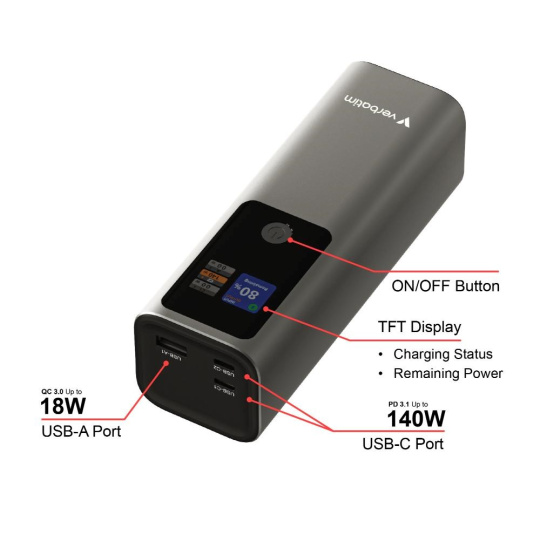 VERBATIM Powerbanka Charge 'n' Go, 27000 mAh, 2x USB-C 140W, 1x USB-A 18W, Šedá