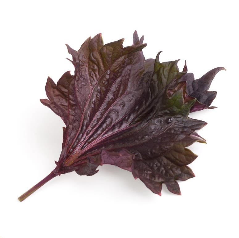 Fialový Shiso: Výrazná chuť s tóny bazalky, anýzu a máty, vhodné do sushi, salátů a nakládané zeleniny. Má antibakteriální vlastnosti, podporuje trávení a obsahuje mnoho antioxidantů..