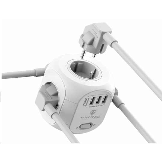 Síťový adaptér Viking AC Cube je praktickou kombinací čtyř zásuvek, čtyř USB portů a 1,8 m prodlužovacího kabelu v jednom, který šetří místo a umožňuje napájení až 8 zařízení současně.