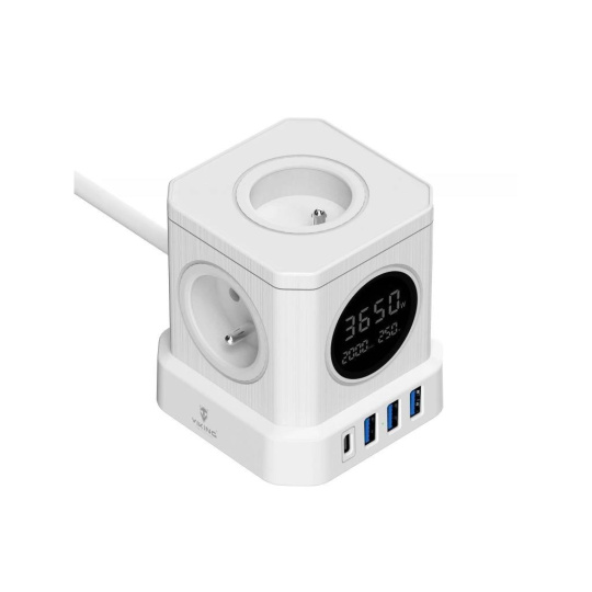 Síťový adaptér Viking ACT44 kombinuje čtyři USB porty (3× USB-A a 1× USB-C), čtyři AC zásuvky a 2m prodlužovací kabel v jednom kompaktním zařízení. Šetří místo a umožňuje napájet až osm zařízení současně.
