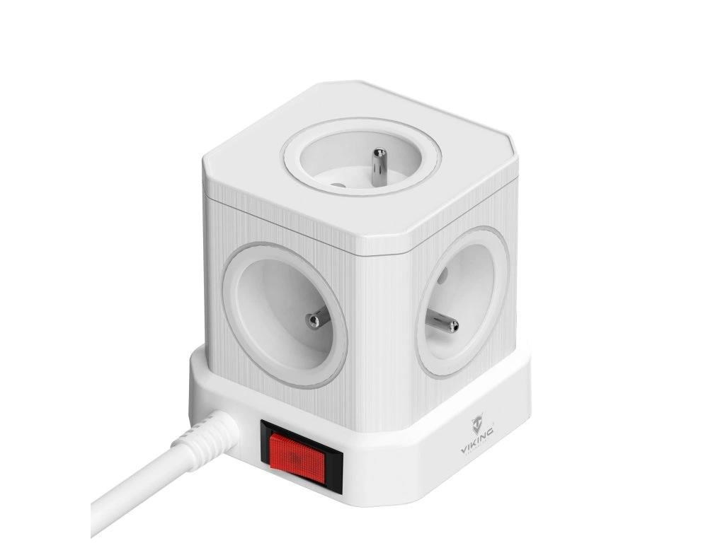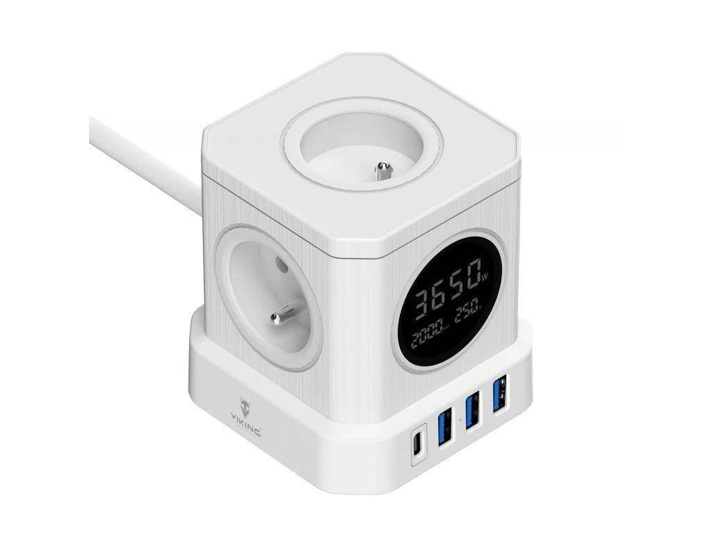 Síťový adaptér Viking ACT44 kombinuje čtyři USB porty (3× USB-A a 1× USB-C), čtyři AC zásuvky a 2m prodlužovací kabel v jednom kompaktním zařízení. Šetří místo a umožňuje napájet až osm zařízení současně.