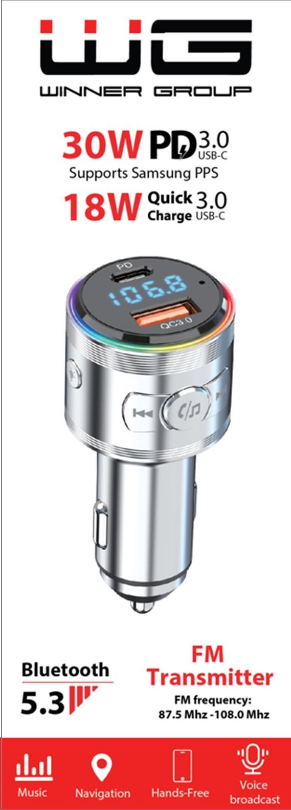 WG - Nabíječka do auta, Transmitter FM, USB-A QC 3.0 18W + USB-C PD 30W, stříbrná