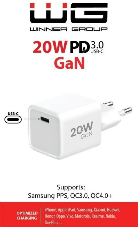WG - Síťová nabíječka GaN 1x USB-C, PD 20W, 5V-9V-12V, bílá