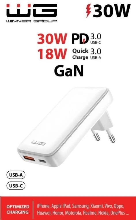 WG - Síťová nabíječka GaN 2x USB, 1x USB-C 30W + 1x USB-A 18W, white