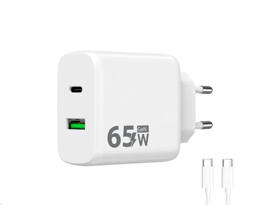 WG - Síťová nabíječka GaN 2x USB 65W, 1x USB-C PD 65W + 1x USB-A QC 3.0 18W, kabel Type-C na Type-C, bílá