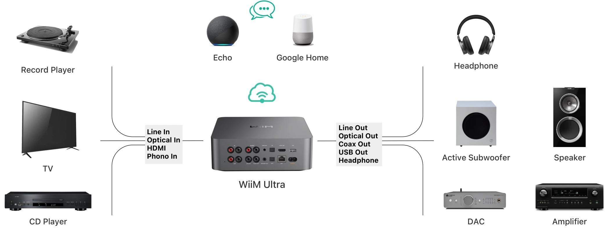 WiiM Ultra disponuje gramofonovým předzesilovačem, tím lze jednoduše připojit gramofon osazený MM/MC přenoskou. Předzesilovač Ultra pomůže nastavit akustickou korekci místnosti pomocí iOS telefonů a tím vylepšit výkon připojených reproduktorů a subwooferu. Subwooferový výstup umožní připojení subwooferu v kombinaci s integrovaným nebo koncovým zesilovačem bez subwoferového výstupu. Navíc díky vestavěnému EQ si lze upravit nízké frekvence dle vašich preferencí. Osazení HDMI ARC vstup umožňuje pohodlně připojit chytrou TV pro co nejjednodušší ovládání hlasitosti. Skrze HDMI lze do předzesilovače posílat Dolby Digital zvuk, díky kvalitnímu integrovanému D/A převodníku dosáhnete skvělého zvuku z TV.