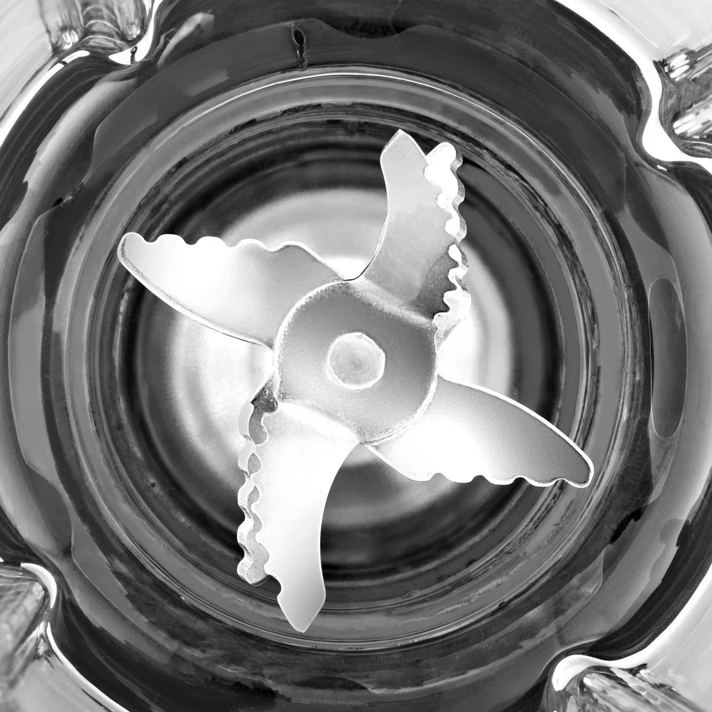 - Bezpečnostní funkce: Mixér se spustí pouze tehdy, je-li skleněná nádoba správně nasazena. Protiskluzové nožičky zajišťují stabilitu při maximálních otáčkách.