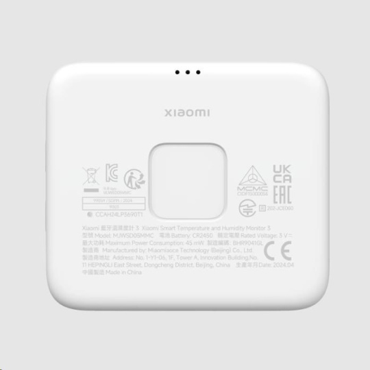 - Obsah balení: 1× chytrý monitor teploty a vlhkosti Xiaomi 3, 1× stojánek, 1× řešení pro upevnění na stěnu, 1× uživatelská příručka, 1× informační karta pro synchronizaci času, 1× záruční list